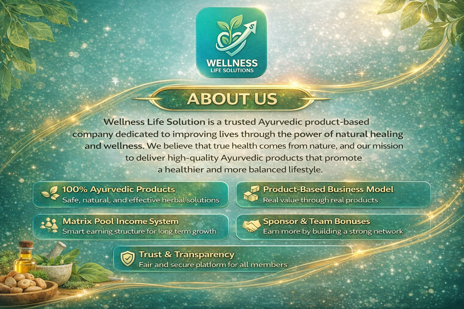 Wellness Life Solution is a trusted Ayurvedic product-based company focused on improving lives through natural health solutions and rewarding business opportunities. We combine the power of traditional Ayurveda with a structured income model to help individuals achieve both wellness and financial growth.